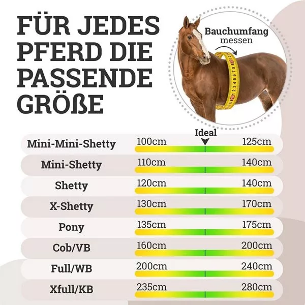 mini mini shetty: 100-125 cm, mini shetty: 110-140 cm, shetty: 120-160 cm, x-shetty: 130-170 cm, ponei: 135-175 cm, cob/VB: 160-200 cm, full/WB: 200-240 cm, xfull/KB: 235-280 cm.