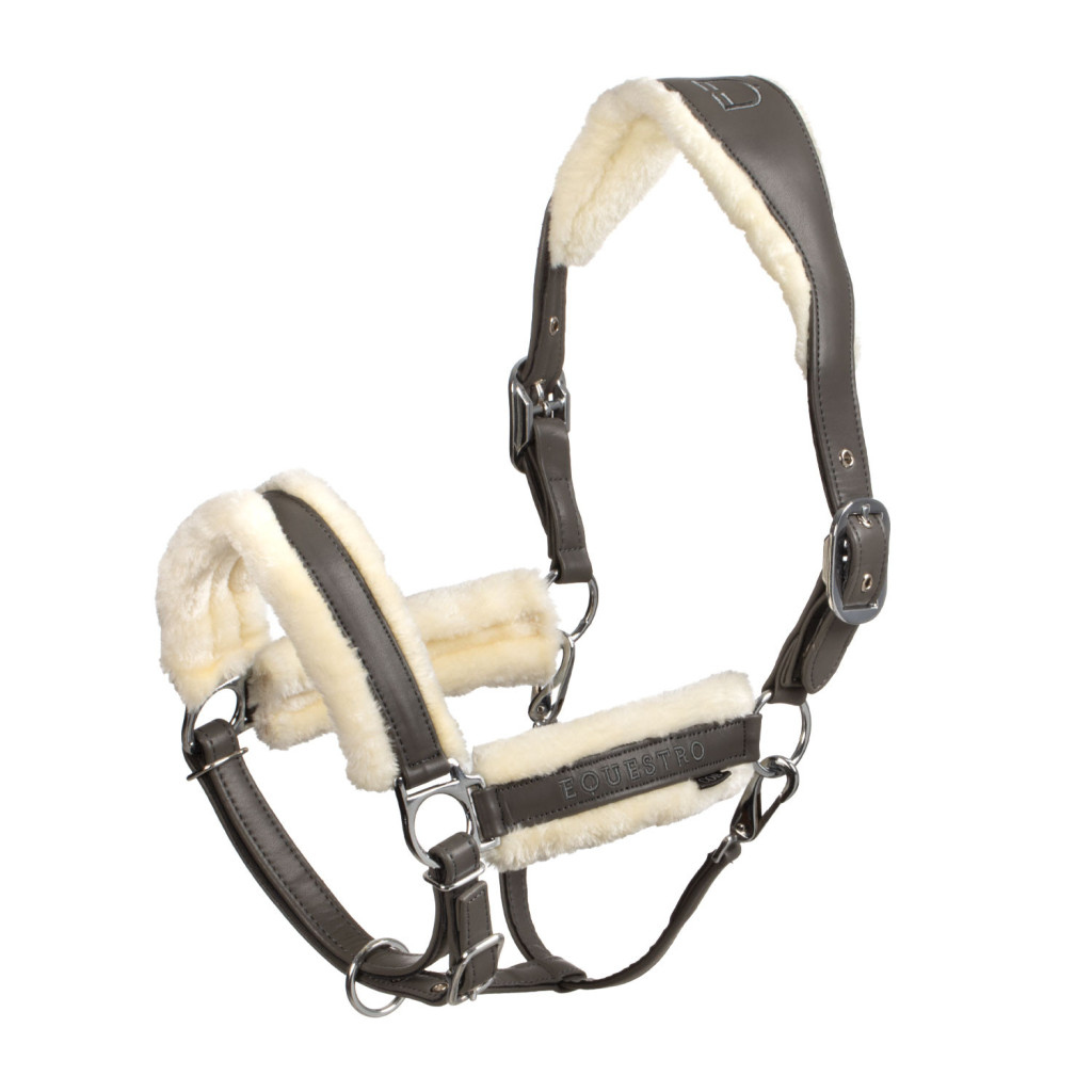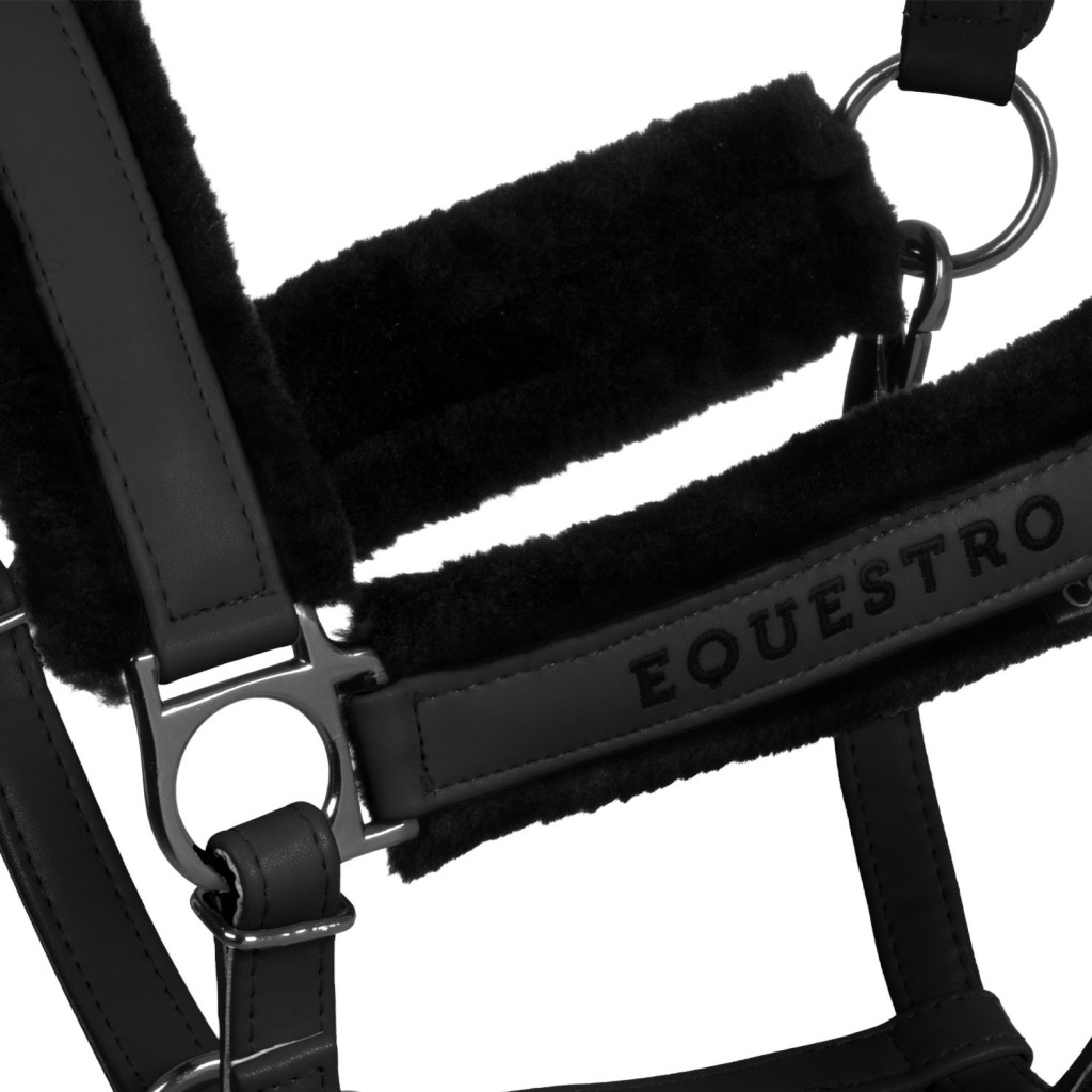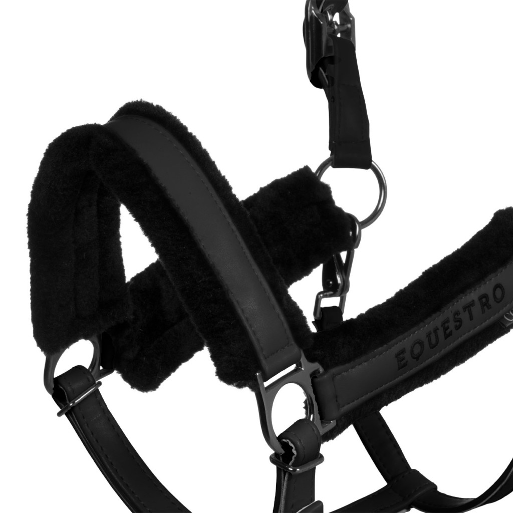 Căpăstru din nylon căptușit cu blană artificială moale de oaie în zonele predispuse la frecare și sensibilitate. Materialele de înaltă calitate oferă un confort incomparabil și o potrivire unică. Căpăstrul dispune de un sistem dublu de reglare cu catarame din oțel inoxidabil pentru siguranță, stabilitate și durabilitate, precum și o notă de eleganță rafinată. Design-ul reglabil și confortabil se mulează delicat pe gâtul și botul calului, oferind o potrivire personalizată și optimă. Ornat cu inscripția Equestro pe lateral și un logo pe tetieră.